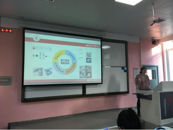接着何凌副教授及同一课题组中的其他老师为同学们介绍了医工结合智能系统。通过生动形象的例子,何老师用幽默风趣的语言让在学未学专业课的同学们了解到了医工结合智能系统下的信号处理,虚拟手术系统和人工智能。杨刚副教授在介绍小型智能设备时指出研究可实现技术的产业化并整治市场产品质量参差不齐状况,规范行业标准。