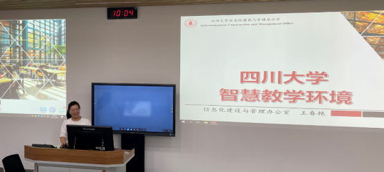 智慧教学环境介绍。王老师对校内智能研讨/报告型阶梯教室、多视窗互动教室、远程互动教室等8类教室和教学楼随处可见的互动交流空间进行详细说明,例如本次活动所在的基C104就是智能研讨型阶梯教室,座椅可360°旋转,桌边安装有电力轨道,配置有电子手写屏等功能,可以协助任课教师开展不同类型的课堂授课。王老师对每间教室安装的爱课堂软件进行介绍,特别是对课堂签到、随堂测验、资料下发、弹幕等等功能阐述。