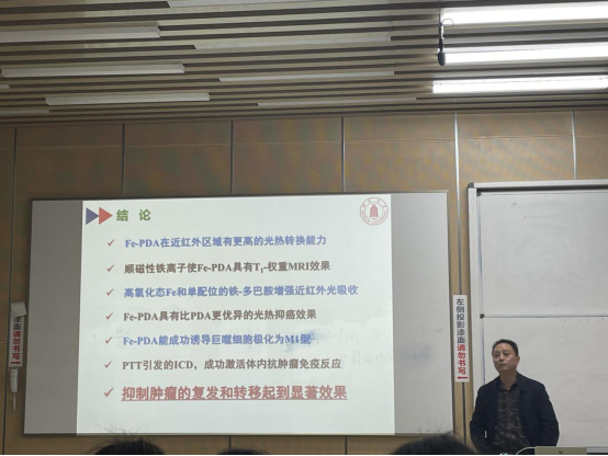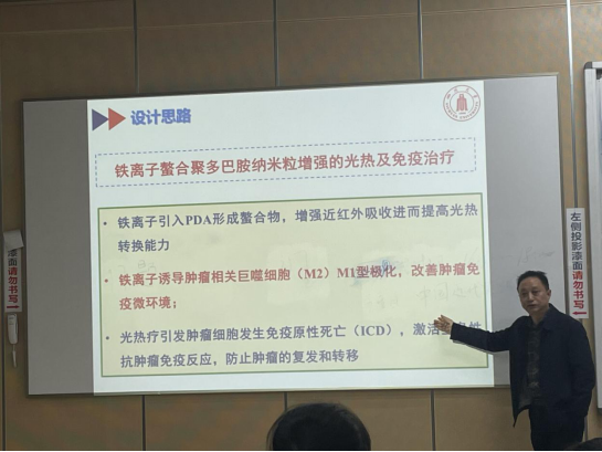 接着,我们需要设计周密的实验方案,才能得出有效研究成果。在此,尹教授介绍了金属离子螯合Fe-PDA材料,从杀灭癌细胞效果、毒副作用等方面,设置了一系列对比实验证明其优良性质。在PPT上,尹教授展示了真实的实验数据和图像,让同学们直观而深刻地感受到科学研究的严谨。
