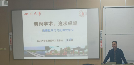 党委书记尹光福教授。尹教授在短短时间内举重若轻地向同学们展示了科学态度在研究学习中的重要性,令人印象深刻。