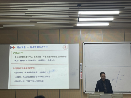 然后,我们要对发现的问题进行展开分析。在此,尹教授从学术角度给同学们分析了光热治疗的原理,提出所用光在穿透性刚需和能量高低上存在的矛盾,需要高效的光热转化材料。进而将问题转换到对光热转化材料PDA(聚多巴胺)的研究上。