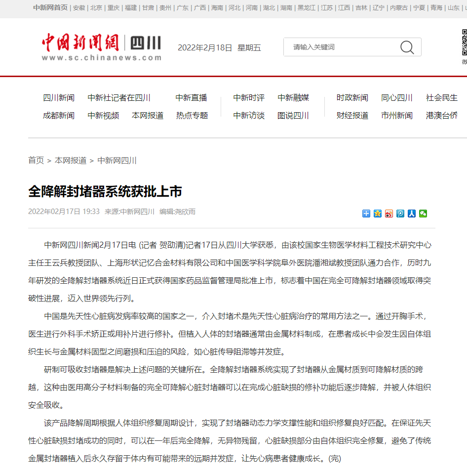 国家生物医学材料工程技术研究中心主任王云兵教授团队、上海形状记忆合金材料有限公司和中国医学科学院阜外医院潘湘斌教授团队通力合作,历时九年研发的全降解封堵器系统正式获得国家药品监督管理局批准上市,标志着中国在完全可降解封堵器领域取得突破性进展迈入世界领先行列。