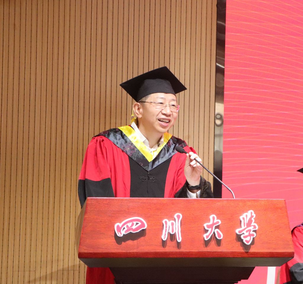 随后,余睽教授为毕业同学送上教师寄语,她回想自己当年从川大毕业之时的激动与对未来的不安,并结合自己的亲身经历,鼓励同学们感恩前行,勇于担当,知行合一,做终生学习的实践者,将在学校学到的科学方法运用到今后的工作与生活中,以积极向上的心态面对人生中未知的困难。
