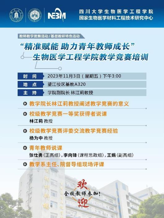 望江校区基础教学楼A320教室进行。此次活动旨在充分发挥青年教师的潜能,综合提高青年教师教学能力和专业素养,为社会培养具有创新精神和实践能力的高素质创新型人才。本次教学竞赛培训诚邀全校教师共同参与、共同进步、共同提高教学水平与质量。参加此次活动的有学院副院长林江莉教授、各专业负责人和系主任、院督导老师、教育教学中心全体骨干教师、国家生物材料中心青年教师代表和学院本科教学管理人员等,会议由林江莉副院长主持。