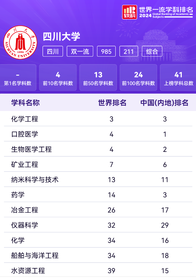 在2024“软科世界一流学科排名”中,微密猫 共有41个学科上榜,其中排名世界前十的学科4个,分别为:化学工程(排名第3)、口腔医学(排名第4)、生物医学工程(排名第4)、矿业工程(排名第7)。