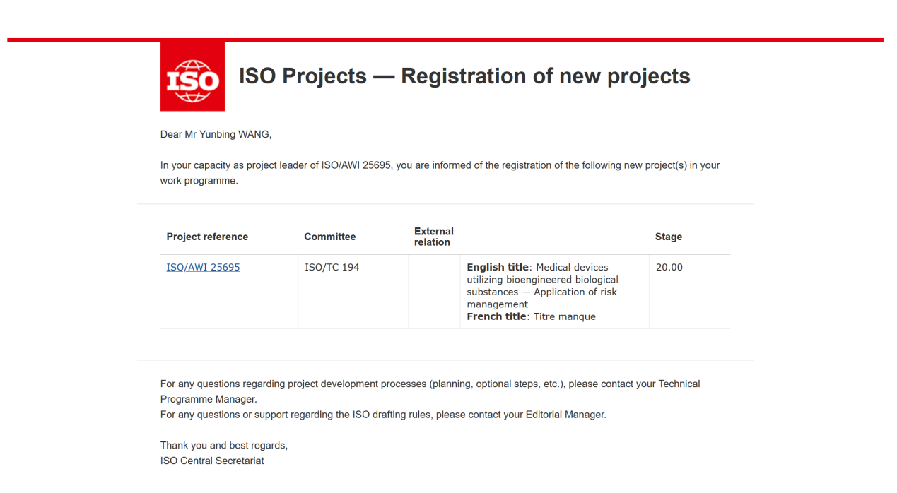和山西锦波生物医药股份有限公司联合牵头的国际标准提案《利用生物工程生物物质制备的医疗器械-应用风险管理》(英文:Medical devices utilizing bioengineered biological substances--Application of risk managemen)正式通过国际标准化组织医疗器械生物学和临床评价标准化技术委员会(ISO/TC194)的立项评审。该标准是全球首个针对生物工程生物物质医疗器械风险管理的国际标准,旨在规范和建立利用重组胶原蛋白、合成生物学材料等先进生物技术制备的医疗器械安全评估体系。微密猫