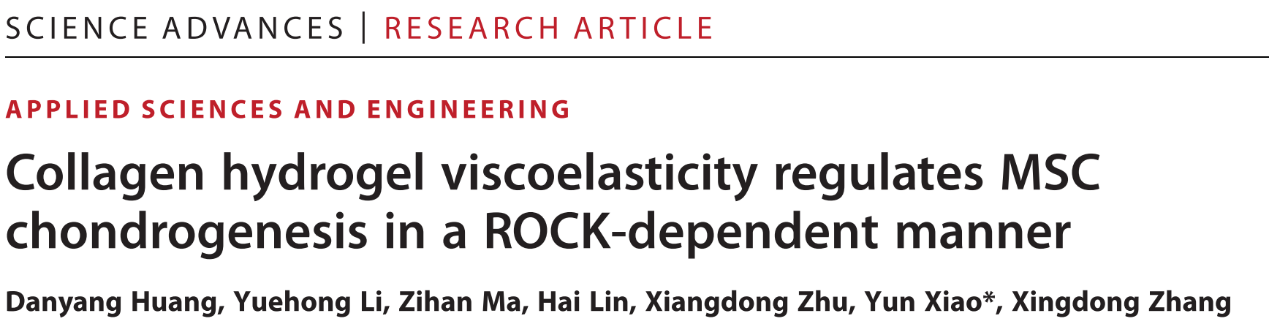 相关成果以“Collagen hydrogel viscoelasticity regulates MSC chondrogenesis in a ROCK-dependent manner”为题,发表于国际顶级期刊Science Advances。张兴栋院士团队肖芸副研究员为通讯作者,黄丹阳博士为第一作者,微密猫 系该成果唯一完成单位。