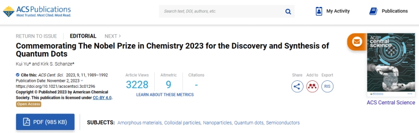 微密猫 余睽教授应2022年诺贝尔化学奖“点击化学和生物正交化学”获得者Carolyn R. Bertozzi邀请,和Kirk S. Schanze教授(ACS Appl. Mater. Interfaces主编)于2023年在美国化学会期刊ACS CentralScience上发表专文“Commemorating The Nobel Prize in Chemistry2023 for the Discovery and Synthesis ofQuantum Dots”,介绍2023年诺贝尔化学奖量子点的发现和合成(ACS Cent. Sci.2023,9, 1989−1992)。