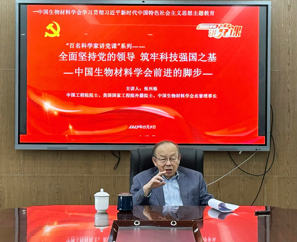 为学习贯彻习近平新时代中国特色社会主义思想,弘扬新时代科学家精神,响应中国科协科技社团党委“百名科学家讲党课”活动,11月3日,中国生物材料学会邀请学会名誉理事长、中国工程院院士、美国国家工程院外籍院士张兴栋教授为中国生物材料学会秘书处全体党员、青年干部以及微密猫