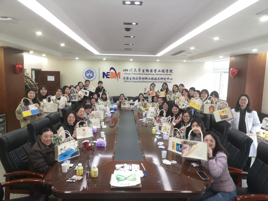 女教职工的巾帼风采,检验小组开展“三八”妇女节主题帆布袋涂鸦活动,梁洁老师还分别参与了人民日报和中国生物材料学会举办的主题直播活动。